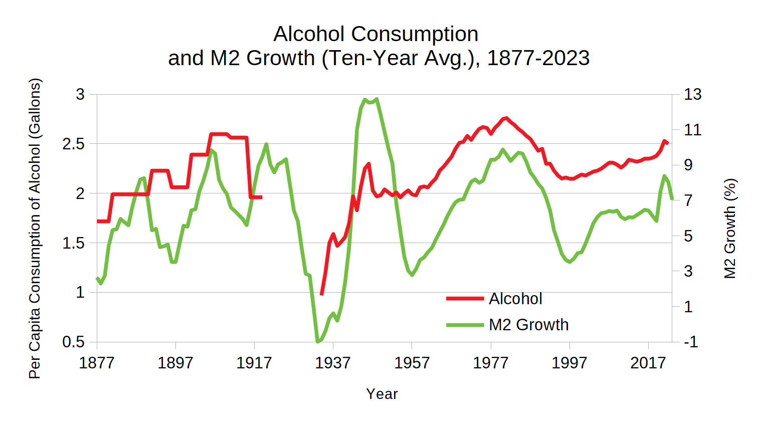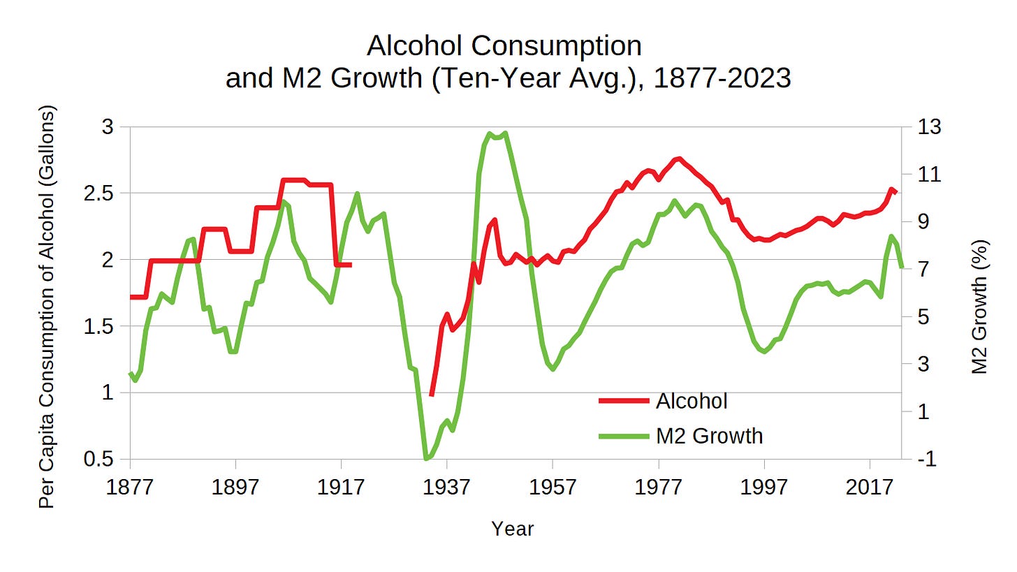 Many individuals develop coping mechanisms to deal with this distress. For example, when we plot alcohol consumption alongside M2 growth, as shown in Figure 4, the correlation suggests that alcohol is used to soothe easy money-induced distress.