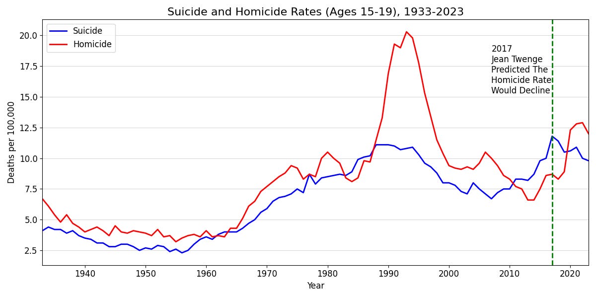 In her 2017 book iGen, SSMT proponent Jean Twenge predicted that youth homicide and suicide rates would diverge—suicide increasing and homicide decreasing—due to the rise in isolation and loneliness caused by smartphones and social media. However, this prediction never came to fruition and likely never will because, as Figure 1 shows, youth homicide and suicide rates have been correlated since the U.S. government began officially tracking this data for all states in 1933.