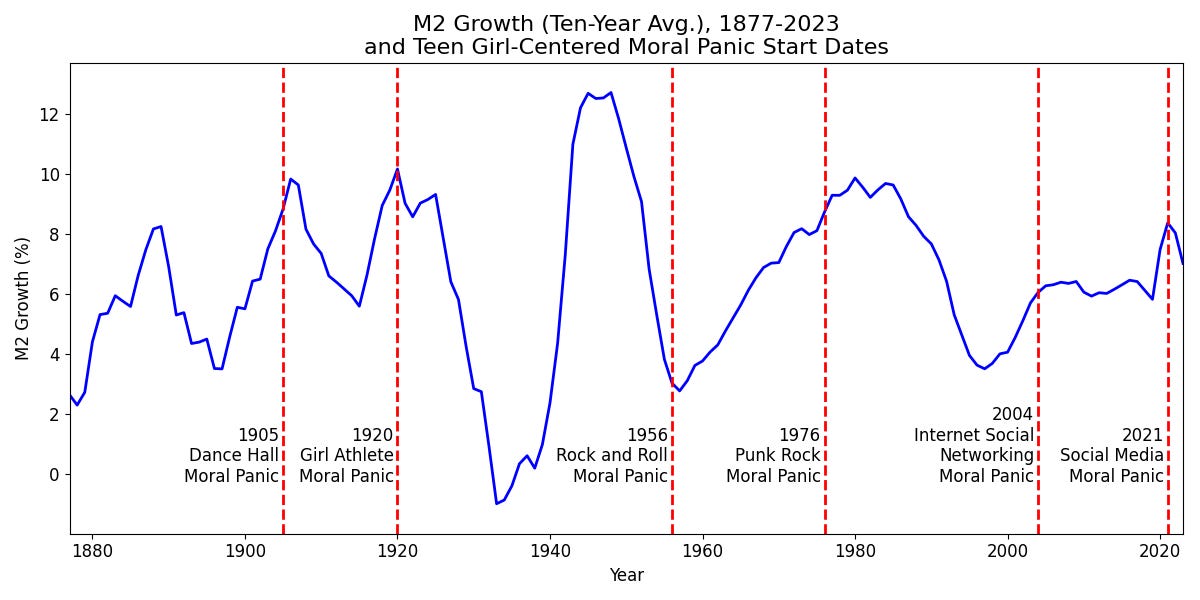 Another way we cope with easy money-induced distress is by establishing a sense of certainty through scapegoating. Figure 5 shows the timing of past moral panics centered around teen girls alongside M2 growth. Since our current moral panic also revolves around teen girls, I have included it as well, marking its start in 2021—the year social media executives were called to testify before the Senate.
