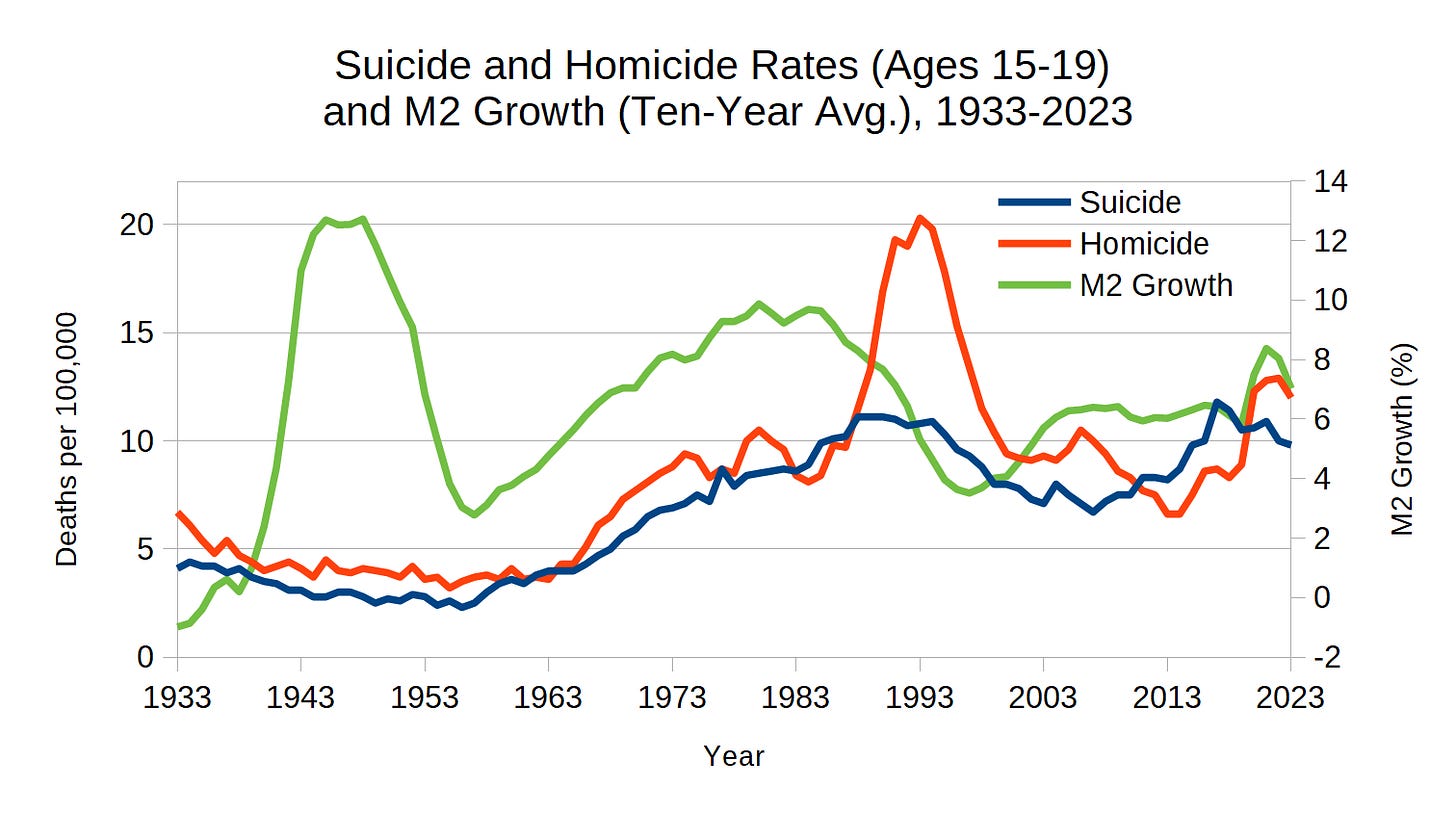 Researcher Meyer Harvey Brenner found that economic instability and insecurity caused by economic cycles are associated with both homicide and suicide rates. According to the Austrian Business Cycle Theory (ABCT), economic cycles are driven by increases in the money supply. By synthesizing Brenner’s findings with ABCT, we can see the connection between suicide, homicide, and the money supply. Figure 2 presents the homicide and suicide rates for individuals aged 15 to 19 alongside the ten-year moving average of M2 money supply growth (M2 growth).