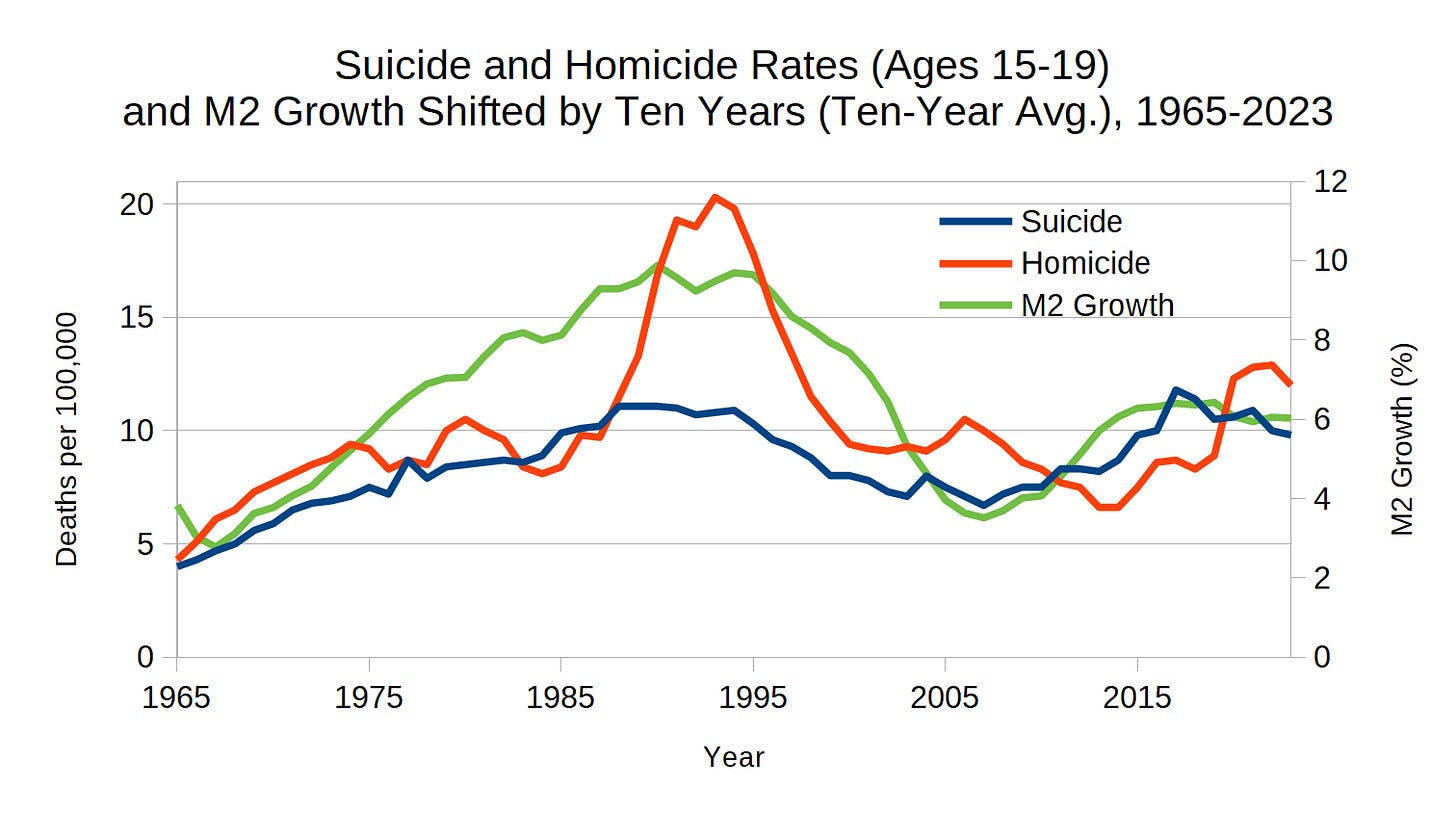 This appears to be what’s happening. A significant increase in the money supply, which often leads to economic instability and insecurity, creates widespread distress. For some, this distress impacts mental health so severely that they die by suicide. In other cases, it manifests as frustration and anger, sometimes culminating in violence. Based on the data, young people seem especially vulnerable to the distress caused by increases in the money supply. I refer to this particular type of distress as easy money-induced distress and my explanation as Easy Money Distress Theory (EMDT).